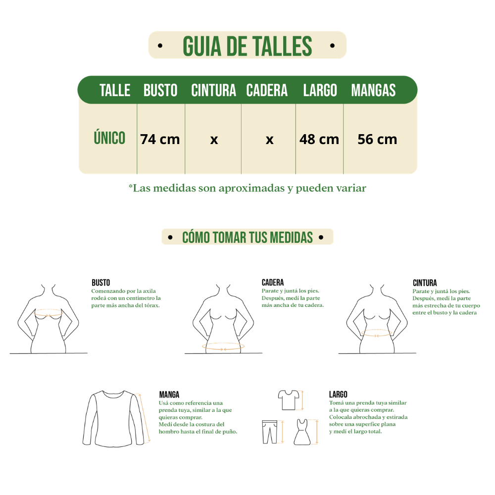 Largo a la cintura o más largo (dependiendo del busto de cada una), textura suave y liviana para adaptarse al movimiento.