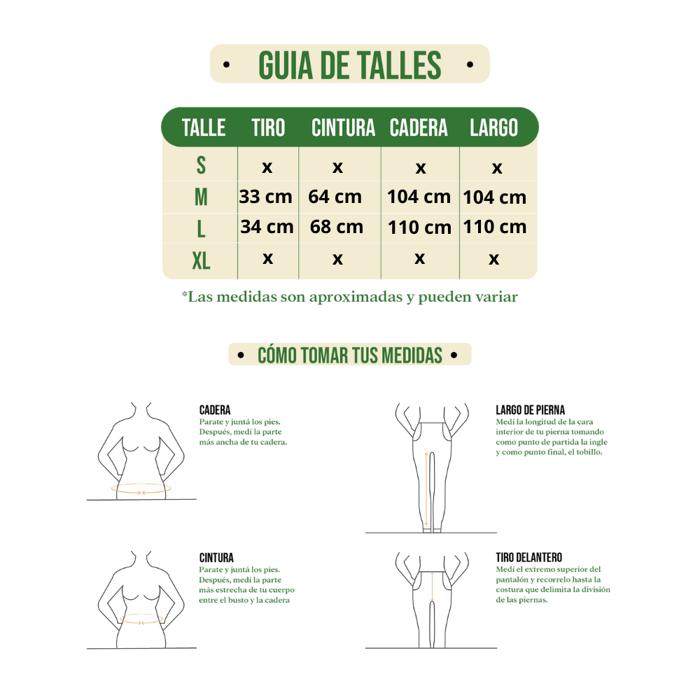 Cintura chata en la parte de adelante y con elástico fruncido en la parte de atrás.